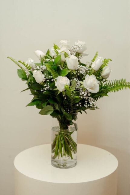 Vase of white roses A delicate glass vase filled with pure white roses, symbolizing peace and purity.